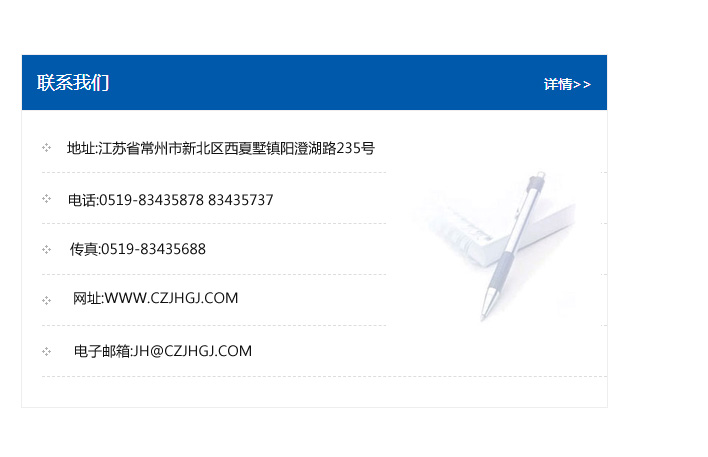 傳真:0519-83435688    郵編:213135    網址:WWW.czjhgj_com.htwy119.com    電子郵箱:JH@czjhgj_com.htwy119.com